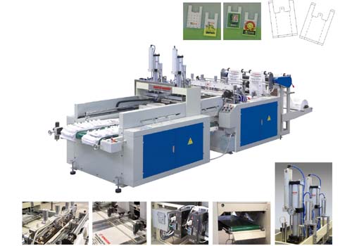 descriptions: This machine is applied to manufacturing and printing the uncolored vest bags made of HDPE,LDPEroll film。It adopts PLC control,double servo(step)motor fixed length and the liquid crystal touch screen actual display to finish the feeding,sealing,cutting,punching holes and good economic result。
